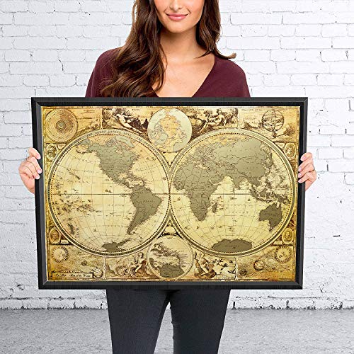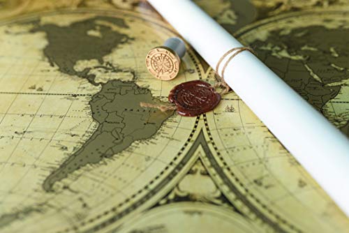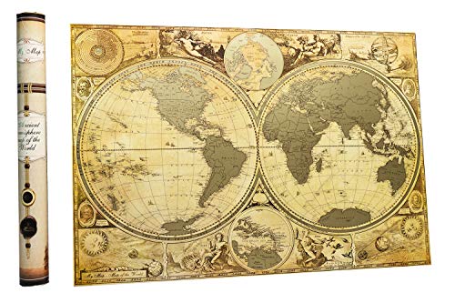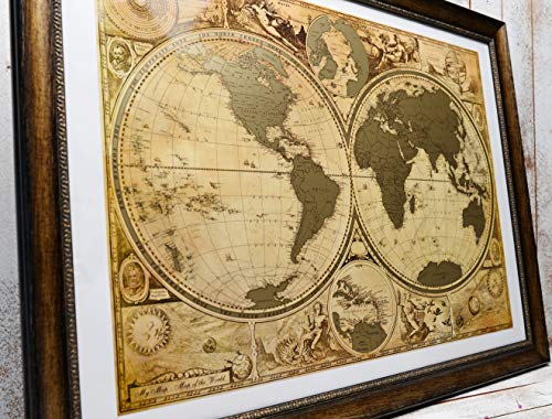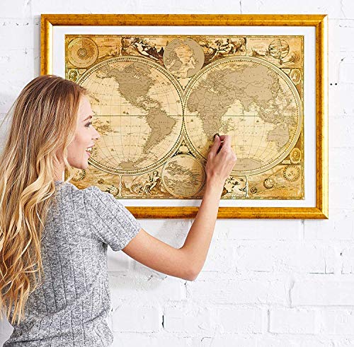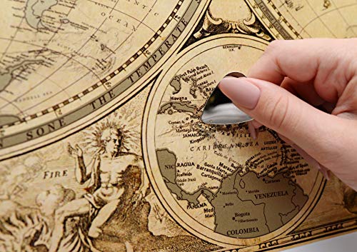 ⭐LUXURY ANTIQUE DESIGN WITH 5 GOLDEN Stamps and PRINT ! Thick Laminated Glossy Paper covered with a golden metallic scratch layer Compact Perfect SIZE 16.5 x 24 Inches - You can Easily find Beautiful Frame for your Scratch off map and mount to the Wall⭐UNIQUE DOUBLE HEMISPHERE MAP with Enlarge Caribbeans islands map, accompanied by portraits of a number of the most important 16th and early 17th Century explorers - Magellan, Drake, Olivier van Noort