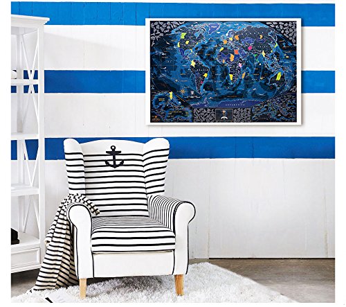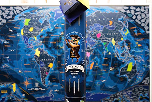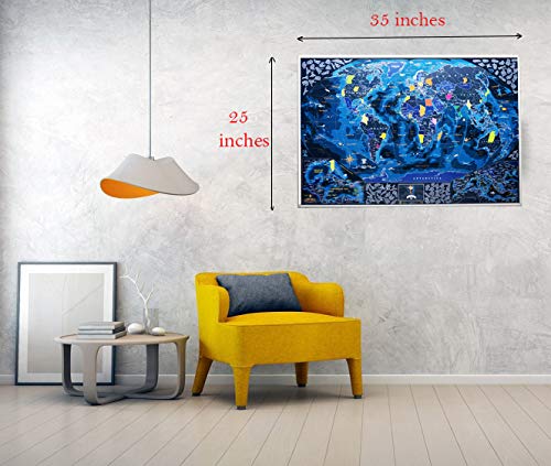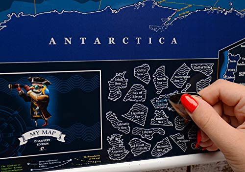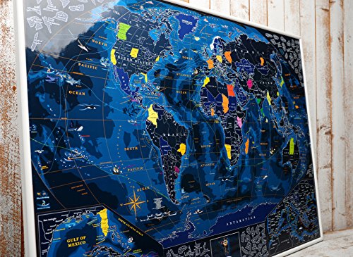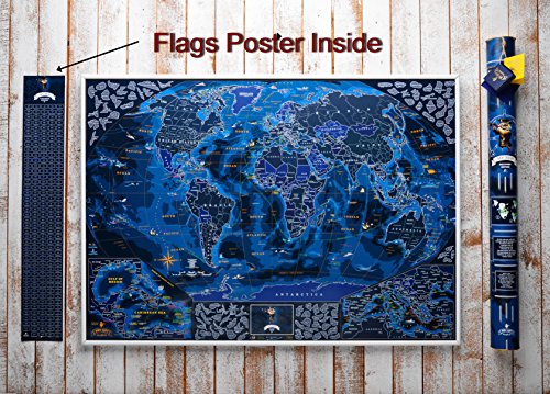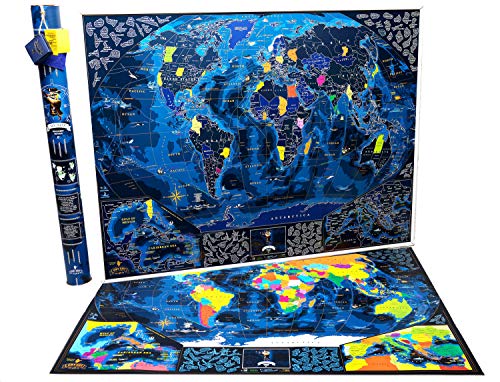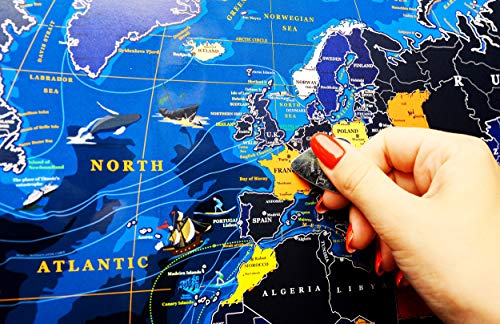 ⭐ MOST DETAILED CARTOGRAPHY, WORLD FLAGS POSTER INSIDE - The most incredible world scratch off map ! The most marine of all marine designs. Saturated blue tones, juicy, bright colors under the scratch layer, relief oceans.⭐ PERFECT GIFT FOR TRAVELERS for him and her! Our map comes in gift ready packaging to delight the travel enthusiasts in your life. A perfect conversation starter, give them a fun and special moment scratching the map with friends and family while sharing travel stories. It's a great learning tool for kids as well.